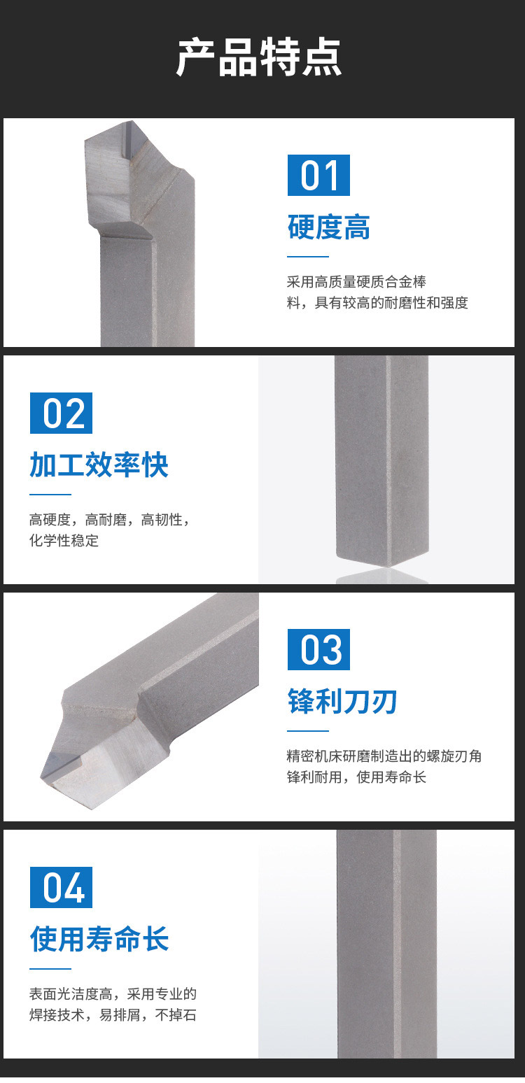 1.硬度高:采用高質(zhì)量硬質(zhì)合金棒料,具有較高的耐磨性和強(qiáng)度;