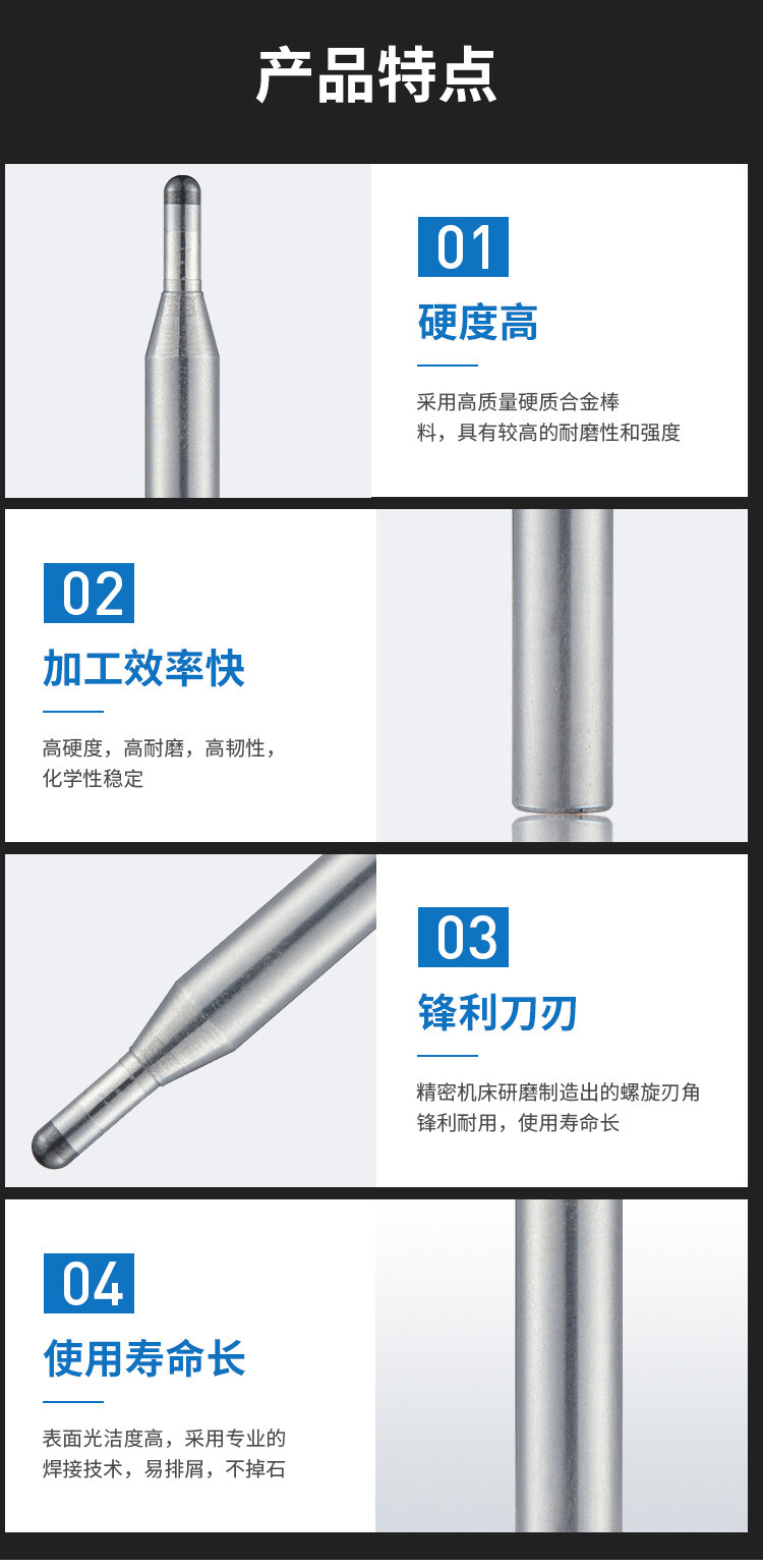 1.硬度高:采用高質(zhì)量硬質(zhì)合金棒料,具有較高的耐磨性和強度;