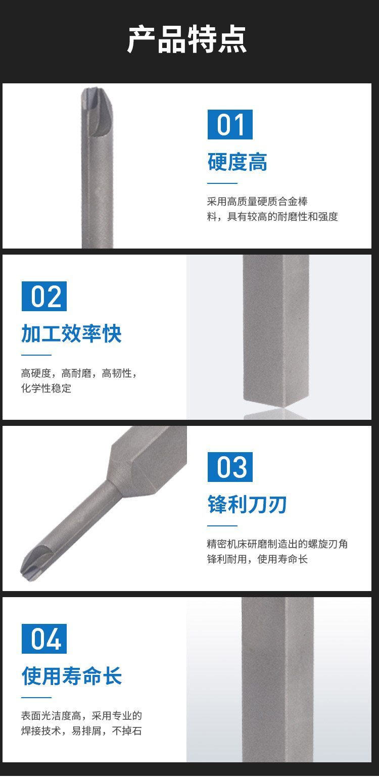 1.硬度高:采用高質(zhì)量硬質(zhì)合金棒料,具有較高的耐磨性和強度;