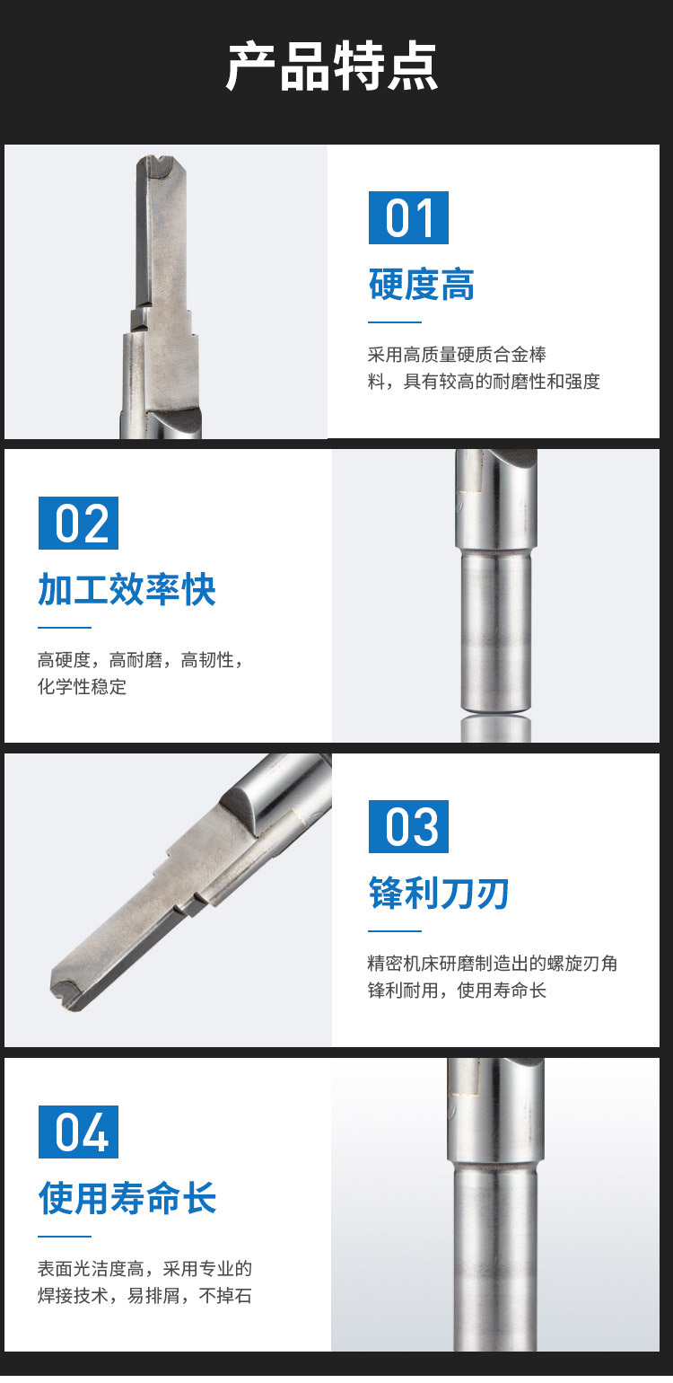 1.硬度高:采用高質(zhì)量硬質(zhì)合金棒料,具有較高的耐磨性和強度;