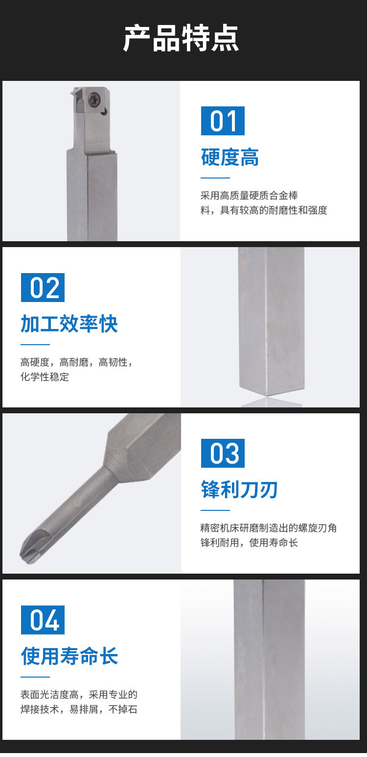 1.硬度高:采用高質(zhì)量硬質(zhì)合金棒料,具有較高的耐磨性和強(qiáng)度;