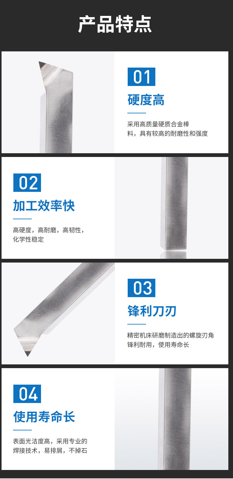 1.硬度高:采用高質(zhì)量硬質(zhì)合金棒料,具有較高的耐磨性和強度;